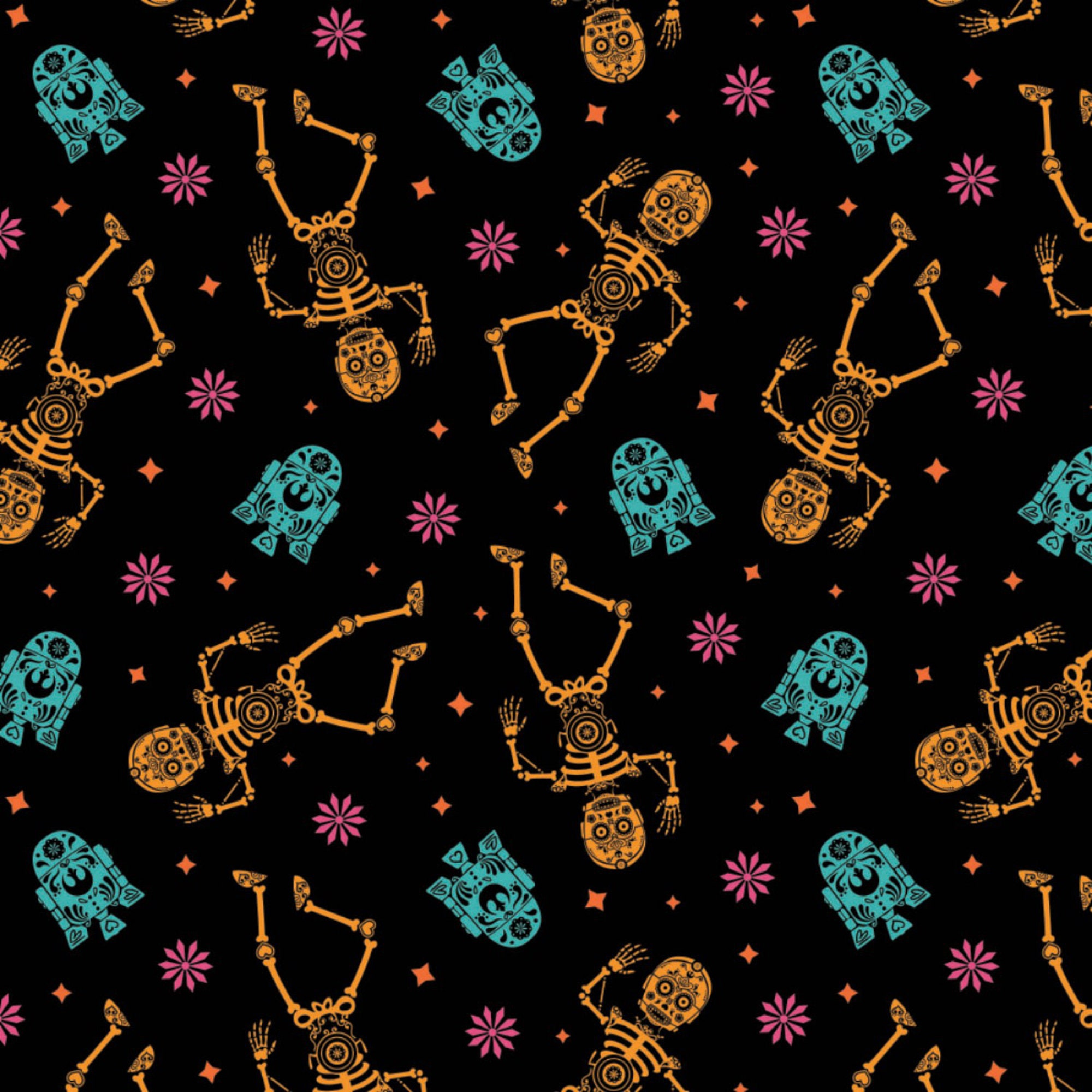 Star Wars Sugar Droids! Your favorite bots R2D2 and C3PO all done up as Sugar Droids!! This is a great print and not just for Halloween! Manufactured by Camelot Cottons in 100% Cotton.