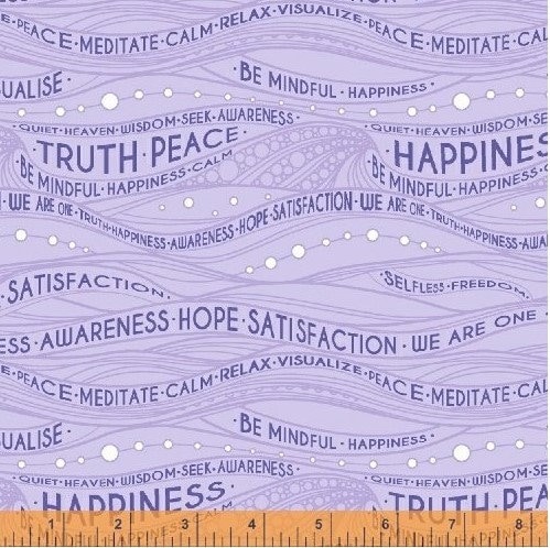 Windhams Be Mindful fabric features inspirational self motivating phrases on a pale lavender background. Fabric is 100% cotton woven