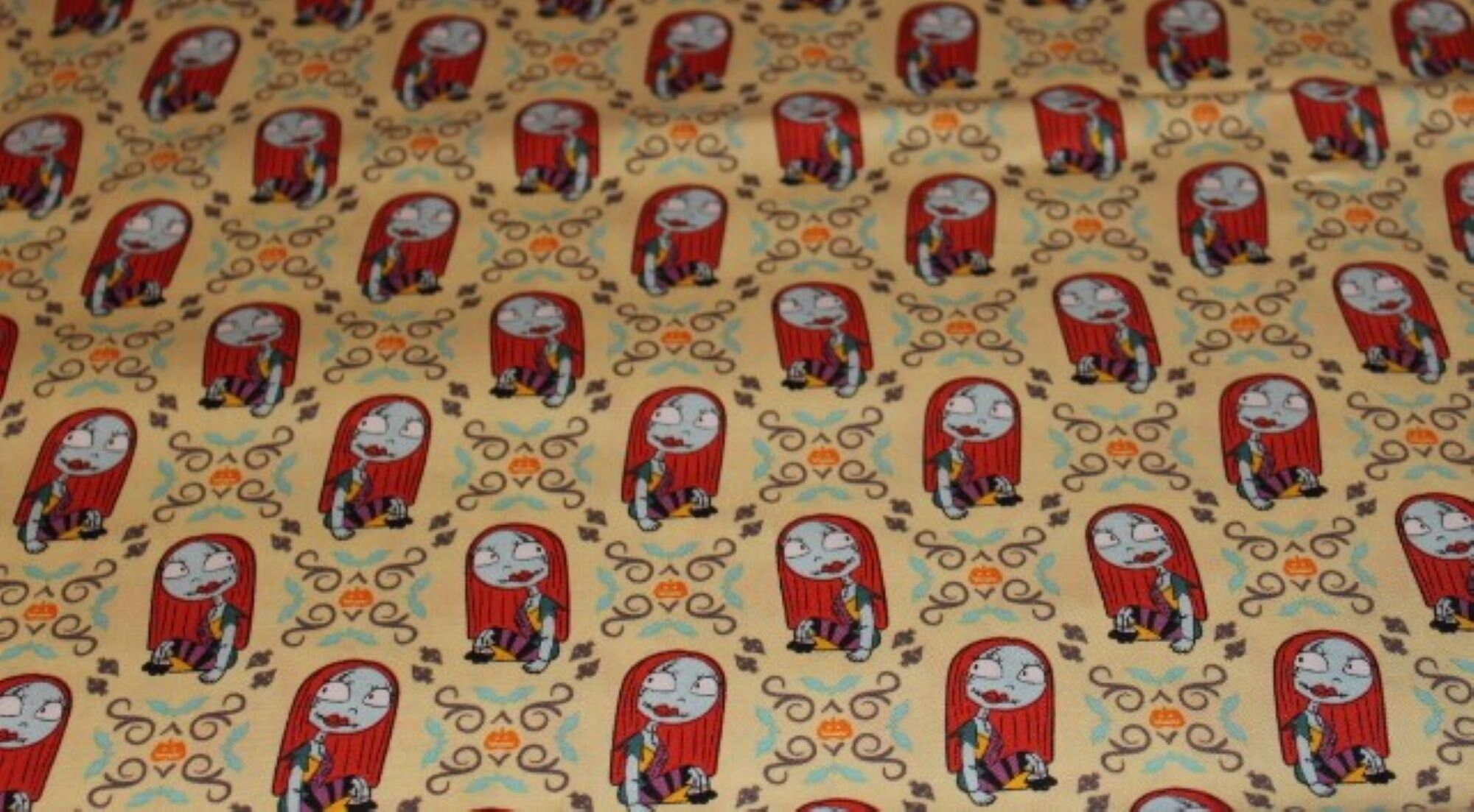 Features Jack's favorite gal Sally in a staggered linear format on a pale yellow background. Manufactured by Camelot in 100% cotton.
