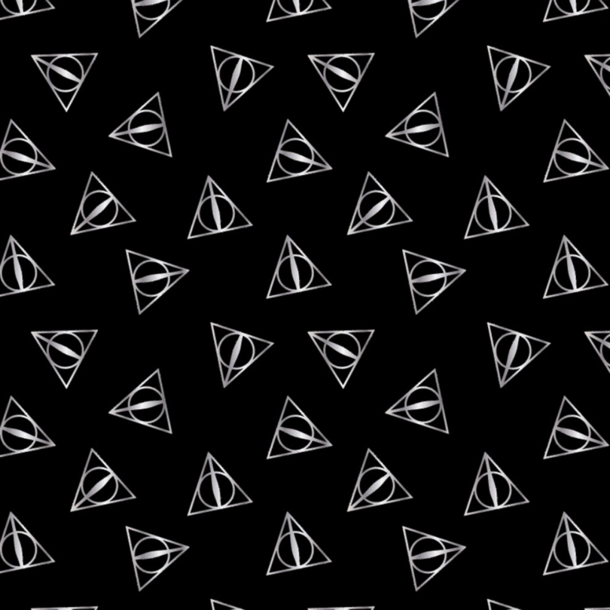 Deathly Hallows Logo in a tossed format on a black background. Logo is in silver metallic! Manufactured by Camelot in 100% Cotton.