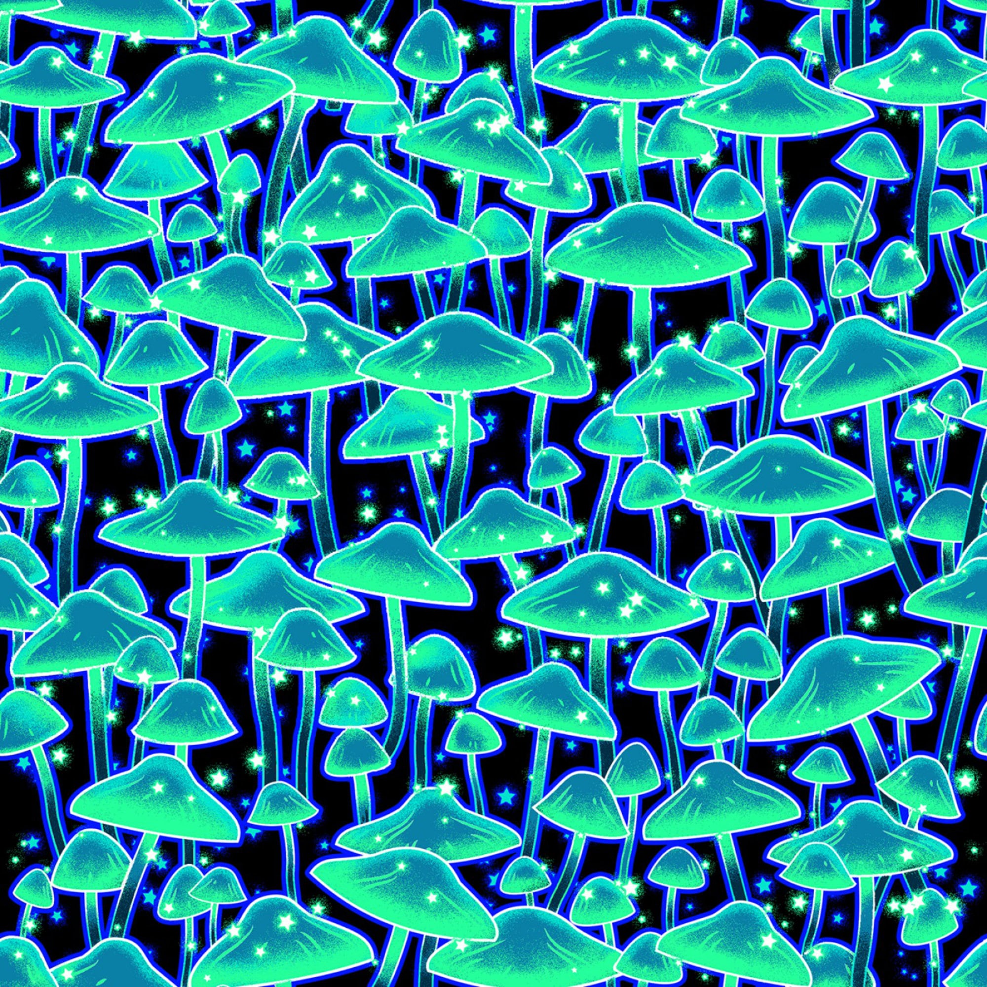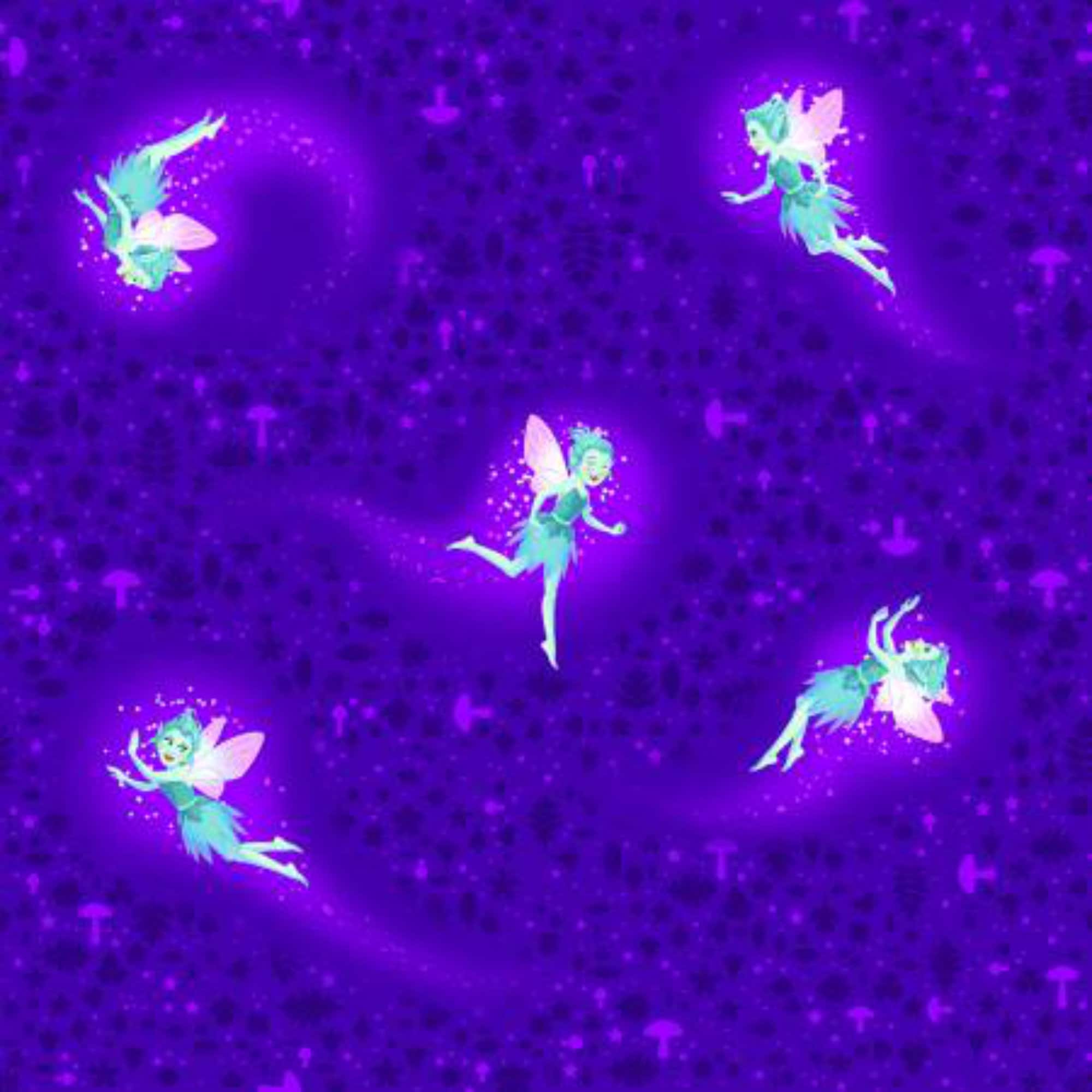 A Summer Night Soiree with Glowing Fairies and Mushrooms in A Gorgeous Floral Forrest!! Pick your Fairies! Done on Navy Background with Purple or Black Background with Green...or maybe Multicolor is your favorite! Manufactured by Henry Glass in 100% Cotton.